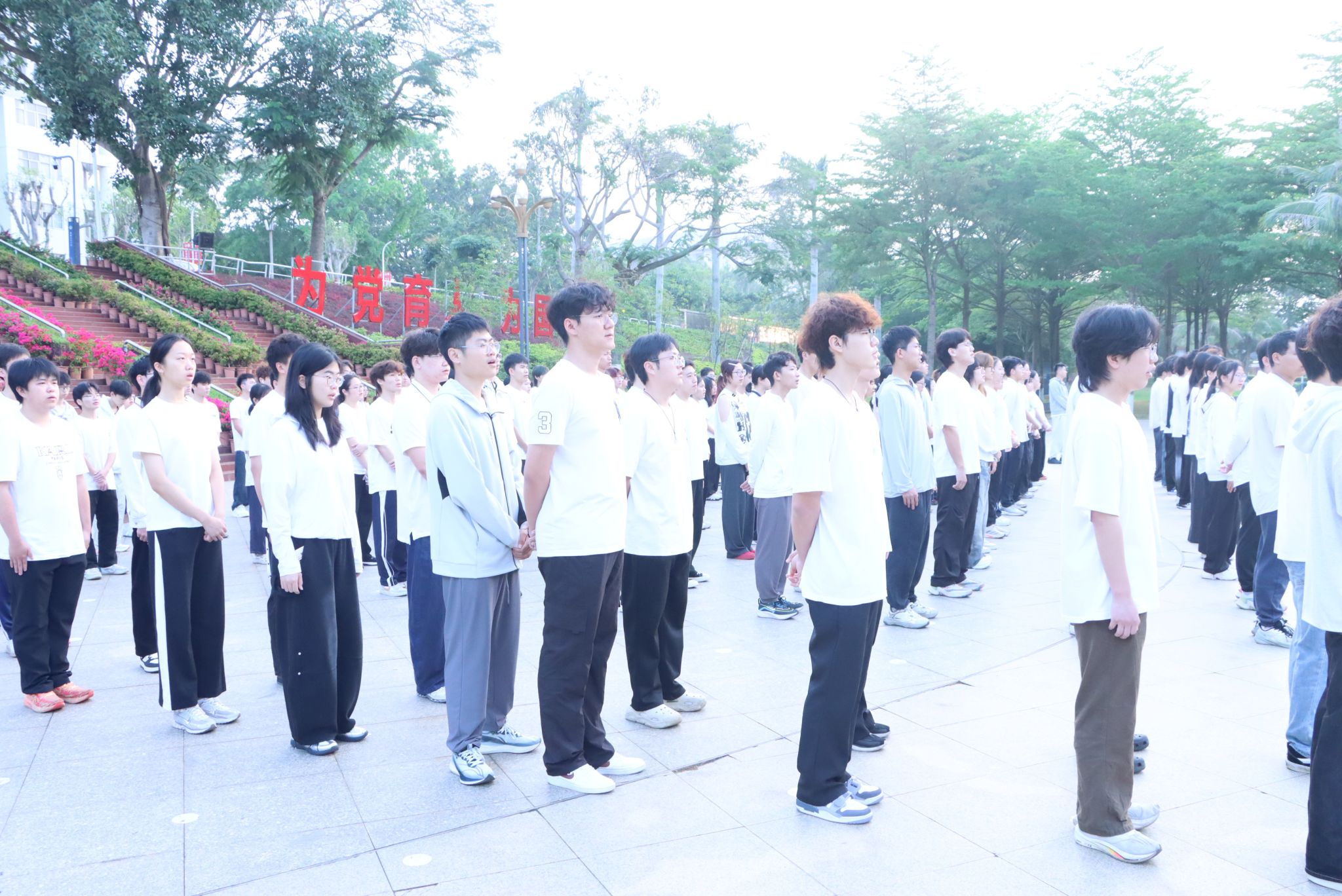 晨光熹微,清风徐来,仪式在肃穆的氛围中拉开帷幕。国旗护卫队队员身着礼服,身姿挺拔、步伐铿锵,怀着对祖国的无限崇敬,迈着整齐划一的步伐护送五星红旗入场,全场人员肃立致敬,目光紧随国旗,尽显青年学子的昂扬风貌。伴随着雄壮激昂的《义勇军进行曲》,五星红旗冉冉升起、迎风飘扬,全体参与人员面向国旗肃立,高声奏唱国歌,歌声里承载着对祖国母亲的深情祝福,更凝聚着新时代青年的责任与担当。优秀学生代表发言完毕后,全场齐唱校歌,嘹亮的歌声回荡在广场上空,传递出学院学子逐梦强国、勇担使命的坚定信念。